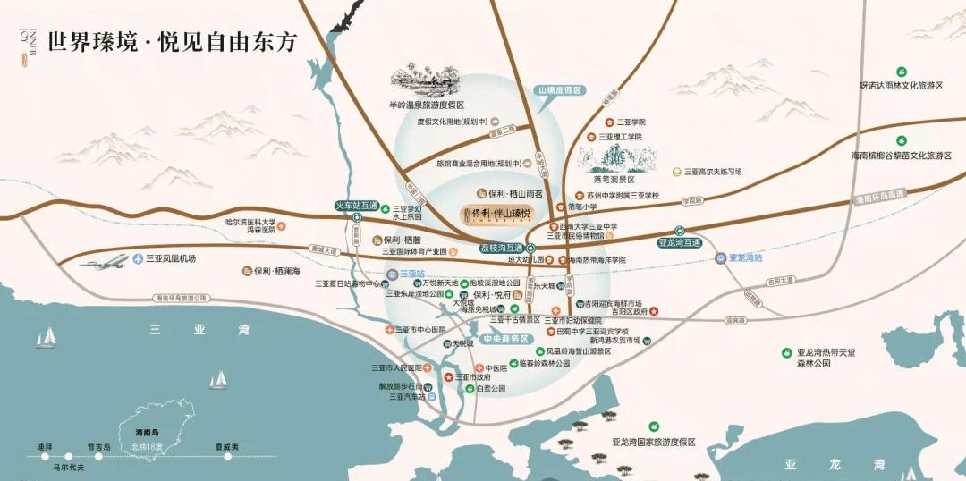 保利·伴山瑧悦项目紧邻承载自贸创新、城市服务、政务服务和生态宜居为一体的抱坡新城三亚新中心,住在这儿,无论是休闲娱乐、教育资源、生活的烟火气还是医疗资源,都是举步即达的便利。