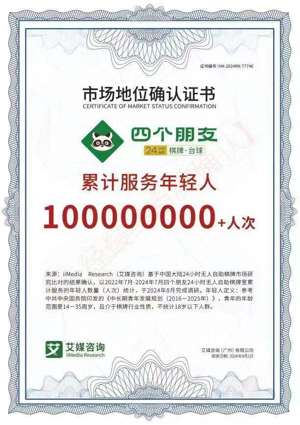 创业者因大环境而改变,大环境则塑造创业者。在“高频刚需、受众广泛”的市场定位下,“四个朋友”进一步提升了项目的投资安全性。棋牌娱乐、台球竞技等社交娱乐形式,覆盖了学生党、上班族等多个年轻群体,不受地域、季节的限制,具备持续稳定的消费需求。而品牌覆盖全国30+个省、300+个城市的加盟网络,以及超行业前10名总和的门店数量,充分证明了其商业模式的普适性与可复制性。无论是一线城市还是县域市场,都能快速适配当地消费需求,为投资者开辟广阔的市场空间。