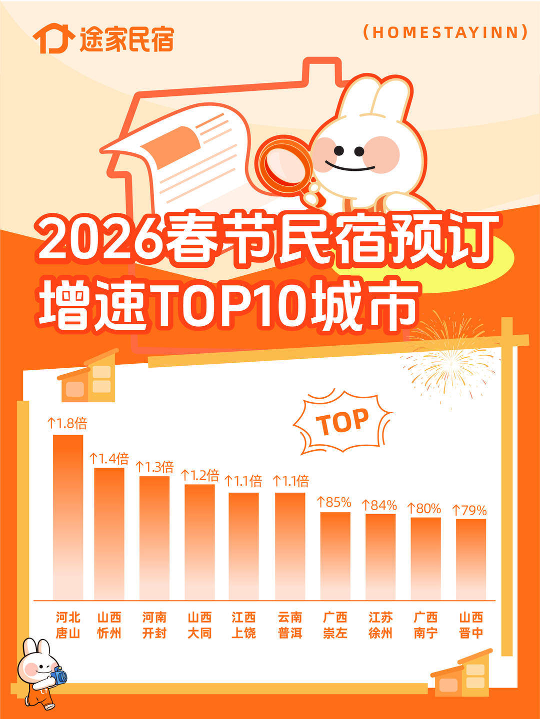 数据显示,今年春节,山西忻州、大同、晋城、临汾等城市的民宿订单均翻番增长。河南开封、洛阳也凭借万岁山武侠城等中式主题乐园带来的沉浸式体验,双双跻身全国民宿预订量TOP20城市。此外,河北唐山河头老街的“大唐千灯宴”与非遗打铁花表演,吸引了大量京津游客,带动唐山民宿预订量同比增长达到1.8倍。