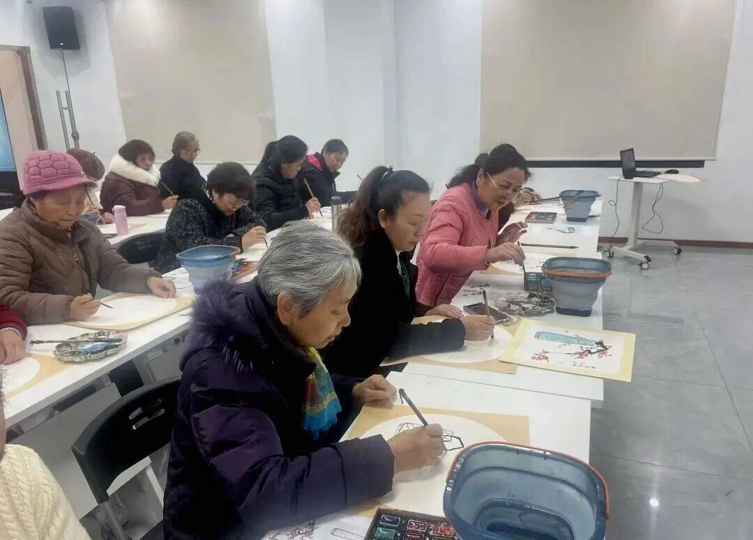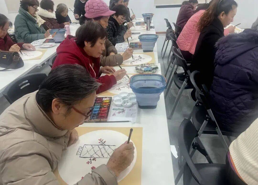 随后,在老师的专业指导和志愿者的贴心协助下,老人们逐步掌握了运笔技巧与国画梅花的绘画要领。一幅幅作品完成后,大家互相欣赏画作、交流心得,追忆往昔生活里的冬日趣事,活动室里回荡着阵阵欢声笑语。